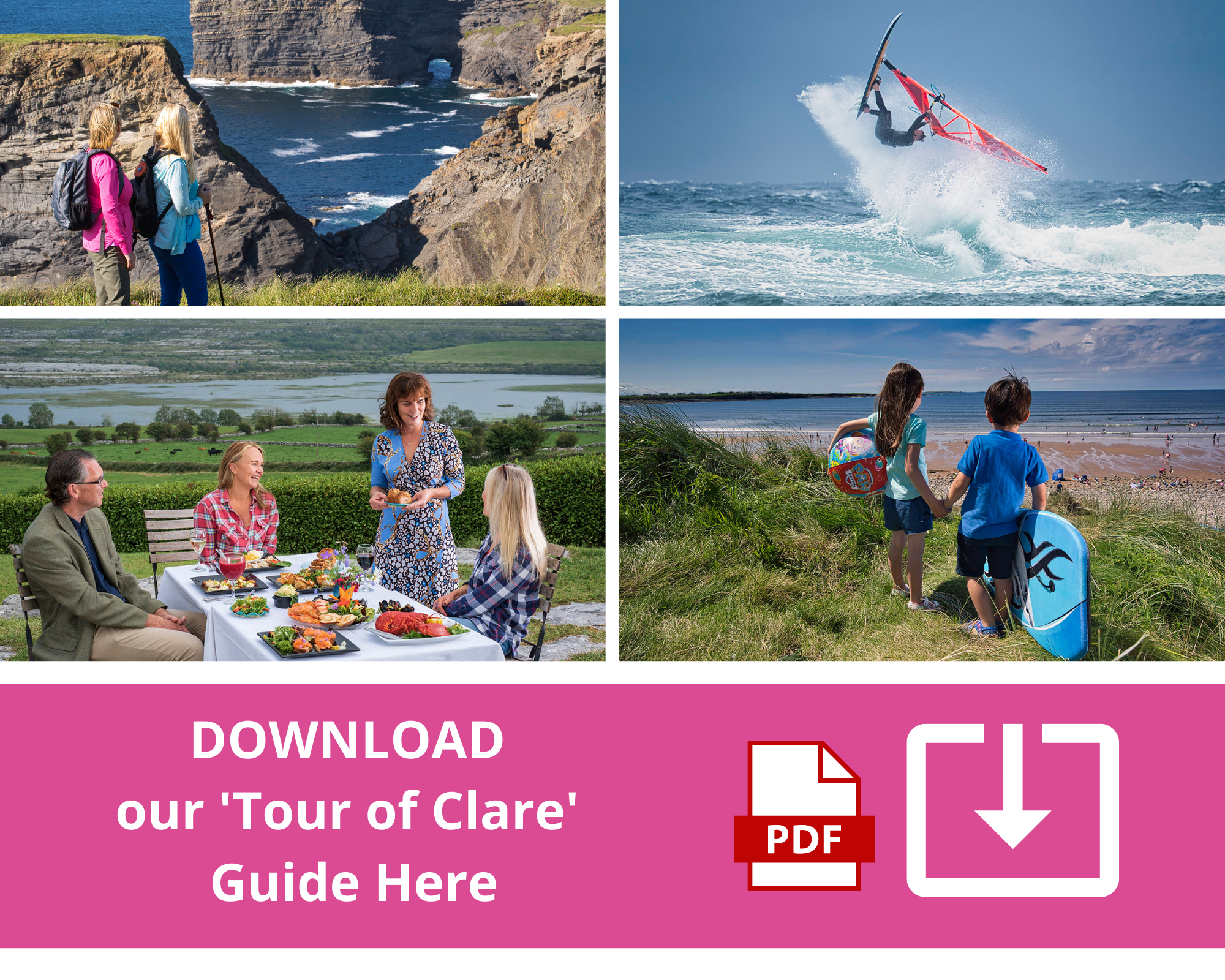 County Clare is renowned for its scenic beauty of infinite contrast, clean air, Atlantic seascapes, majestic rivers and lakes. It also offers a great choice of accommodation, brilliant leisure and sports activities, top visitor attractions, all wrapped up in the warmest of warm welcomes.